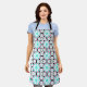 Cheerful geometric pattern with flower, square, octagonal shapes arranged in a tile-like formation. Also, complemented with petal-like and abstract motifs. It incorporates a mix of colours, in the shades turquoise, pink, black, and white. The contrasting colours and symmetrical layout give this pattern a modern, yet retro feel.