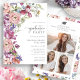 Modern Floral Graduation Party Invitation. Announce your graduate’s big day with a beautifully designed invitation, featuring a graceful side bouquet of hand-painted jewel-toned florals paired with refined calligraphy for a sophisticated touch. Rich hues of purple, magenta, burgundy, blush pink, dusty blue, and sage greenery bloom across the front, while the back offers space for three favourite photos. Personalise every detail—from wording to fonts and backgrounds—making it a true reflection of their personality. Create a stunning first impression and celebrate this milestone with elegance!