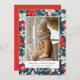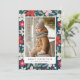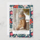 Modern holiday photo cards featuring red poinsettia flowers and winter flowers in shades of light pink and off-white complimented by pine needles and sage green leaves against a navy background. Personalise the front of the card by adding your favourite photo, holiday greeting, and name. The reverse side of the card displays two more photos and the year.