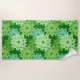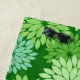 Beach towel in a modern take on a traditional Japanese floral kimono print - stylised flowers in shades of lime green and aqua on a deep emerald green background