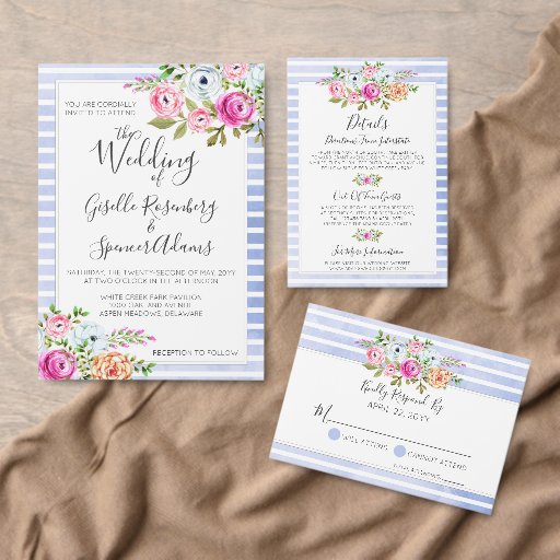 Timeless vintage roses in shabby watercolor style - a fresh, on-trend wedding design for your special celebration! Stylish navy blue stripes, dreamy floral accents, romantic script. Elegantly unique, with a hint of rustic farmhouse chic.