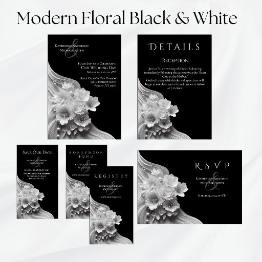 Introducing these Modern Elegant Wedding Dinner and Bar Menu Cards, the epitome of style for your special day. With a sleek double-sided design in black and white adorned with white flowers, these cards effortlessly combine modern aesthetics with timeless elegance. Elevate your wedding experience with these chic menus, guiding your guests through a culinary journey that mirrors the sophistication of your celebration. Crafted to perfection, they are visually stunning complementing your wedding decor seamlessly. Make a statement with every detail—order these Modern Elegant Menu Cards for a beautiful wedding celebration!