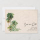 Watercolor palm tree design photo save the dates for your beach destination wedding in Florida! Share your favourite engagement photo and your upcoming wedding details with family and friends with these modern beach wedding save the dates.