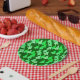 Paper plates in a pattern of Mid-Century Modern, flower embellished, Christmas trees in a silky gradient - trees in shades of pale mint and lime green on a dark pine background