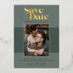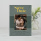 This modern Save the Date design is sure to make everyone excited about your upcoming wedding! Featuring the words "Save the Date" set with modern and stylish typefaces and accented with real pressed gold foil, a photo frame for your photo also accented in real pressed gold foil on top of a large horizontal forest green colour block on a lighter moss green background. So earthy and beautiful. Foil colour can be changed from gold to silver or rose gold. Background colour and colour block can be changed in the design tool.