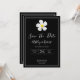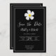 A simple modern design with a symbolic flower, white script type and a white outline on formal black. The backside has all the wedding details, personalise the front and back to the details of your special day. A classic look for a formal affair. Matching style on Bridal Shower, RSVP, Save the Date and more. The Hawaiian Lei flower, Plumeria is a symbol of "new beginnings".