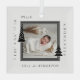 Minimal and elegant, this keepsake baby photo ornament beautifully captures your newborn’s first Christmas. Featuring a classic black and white striped frame, the design highlights your baby's photo with timeless style. Surrounding the image, delicate evergreen trees and modern typography showcase your baby's name, birth date, time, and stats in a clean, contemporary layout. A meaningful and stylish way to commemorate a precious moment during the holiday season. Hand-drawn original illustration by ©Moodthology Papery