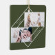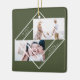 Elegant and modern white geometric frame with two photos and minimal Merry Christmas typography with name green Christmas holiday ornament.