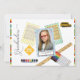 Add style and a modern touch to your child's graduation with this photo frame layout with school items in the background. "Graduation" script at left and items are a school bus, school crossing sign, a ruler, colourful markers, and watercolor paint palette. Three polka-dot frames (yellow, green and blue) with the top one as a photo template. Add name and graduation year under photo. Unique stripes at top and bottom on white background on front and back. Text templates are included.