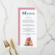 This elegant wedding menu features a playful watercolor illustration of colourful French macarons, adding a touch of Parisian charm and whimsy to your event dinner details. The clean white front displays each course in a modern serif font, with soft blush pink headings for a romantic accent. The reverse side is a solid modern minimalist pink background, perfect for a cohesive, contemporary look. Ideal for spring, summer, or French-inspired celebrations, this menu blends artistic flair with minimalist style.