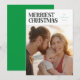 Merriest Christmas in modern font on a portrait photocard with the photo bottom part of the card. Family name in bright fun colours.