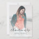 Modern, minimalist photo funeral invitation to celebrate the life of your loved one in a minimalist clean simple design style featuring a handwritten script font and a soft dove grey background. The invitation can easily be personalised with your own photo and text to create a special tribute for your loved one's funeral, memorial or celebration of life. The image shown is for illustration purposes only to be replaced with your own photo. The placeholder image shows a young woman with long wavy brown ombre hair wearing a leather jacket, orange lace top and white jeans. #funeral #invitation