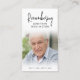 Modern Funeral Photo Remembering Name Prayer Card. Keep the memory of a loved one close with this custom personalised prayer card featuring one treasured photo, the title REMEBERING NAME, dates and an editable heartfelt remembrance message. With its simple classic black and white design and modern handwritten script, it makes a meaningful keepsake to share at a funeral, memorial service or Celebration of Life and offers comfort and a lasting tribute for family and friends. Its small and portable size of 3.5x2" (wallet-sized) makes it convenient for loved ones to carry it with them as a reminder of your loved one’s life and spirit.