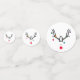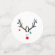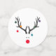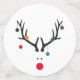 A funny and cute modern abstract pattern of a reindeer head with a red nose. With Christmas ornaments, baubles hanging from the antlers. White background,