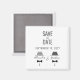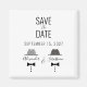 Simple, minimalist, modern black and white gay wedding save the date invitation magnet, with vintage chic hats and bow ties drawing monograms.