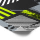 This artwork features a striking combination of geometric shapes and bold patterns. The design uses black, grey, white, bright green, and touches of brown. Diagonal and horizontal stripes dominate the layout, while textured brush strokes, splashes, and animal-like prints add depth and variety. The composition feels like a collage, balancing structured blocks with expressive, chaotic details. The contrast between vivid green highlights and muted grey tones creates a modern and edgy visual impact.
