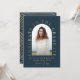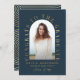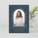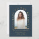 Geometric modern typography elegant navy blue and gold effect photo arch graduation announcement card.