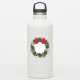 Modern geometric Christmas wreath features green dots in three different shades and sizes with a strand of smaller red dots reminiscent of cranberries winding around the circular pattern. The wreath is topped with a red bow.