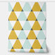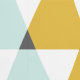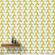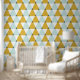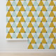Stylish peel and stick wallpaper with a geometric pattern of mint blue, golden yellow, and white triangles—perfect for adding a modern touch to any room.