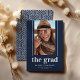 Simple 2025 graduation announcement card featuring a classic navy blue background that can be changed to match any school or favourite colour. The main focus is on the graduate themselves – their photo takes centre stage, with two sleek lines running down either side to add a touch of modernity. The result? A statement that screams "this is the grad!". And of course, their name, school/college, and class year are elegantly displayed, making sure everyone knows who the star of the show is. The bold, geometric pattern on the back adds a touch of sophistication, without taking away from the front.