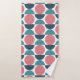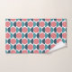 This modern bath towel set features a bold geometric circle and half circle pattern in shades of pink and teal on white.