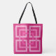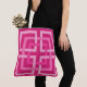 Printed tote bag in a retro modern pattern of interlocking squares, in shades of pastel to hot pink, on a deep fuchsia pink background