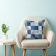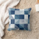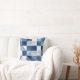 This throw pillow features a modern geometric pattern of squares with hand-drawn lines in shades of blue from light blue to navy blue with white.