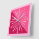 Clock in a Mid-Century Modern, geometric sunburst design made up of triangles, with a diamond shape marking each hour, in shades of fuchsia pink, wine / burgundy and pastel pink, accented with orchid and white