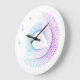 Modern wall clock featuring minimalist geometric line art design on teal and purple.