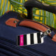 Chic luggage tag features wide black and cream stripes with a magenta pink colorblock accent. Customise the back with your name and contact details.
