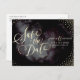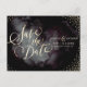 Glamour gold hand lettering calligraphy design and gold dots confetti on dark black sky night watercolor background, shimmer faux metallic gold glitter effect, modern, chic, elegant and classy, perfect for vintage wedding or winter wedding in evening. Custom your own save the date postcard for your wedding invitation set.
