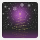 A gleamy and snowy Christmas illustration featuring a shining christmas tree and snowflakes on a purple background.