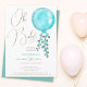 Modern blue glitter boy teal blue balloon Oh baby shower with pretty eucalyptus leaves and branches and pastel blue flowers with a boy blue balloon baby shower invitation with a beautiful elegant script typography.