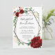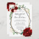 Modern Gold and Merlot Geometric Wedding Invite. These greenery foliage invites will do the trick! This customisable invite features a modern geometric frame with faux gold glitter and black. The borders are adorned with green foliage such as eucalyptus, berries and pink and merlot roses flowers. The sides are adorned with faux gold glitter. This makes a great modern foliage invite.