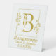 Stylish pedestal sign features gold hand-drawn botanical frame with botanical letter B in centre. Personalise with couple's name and/or date or other message