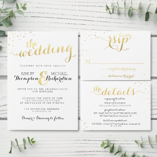 This faux Gold Foil Glamour Wedding Invitation has a faux foil effect with black text, simple yet modern! Matching RSVP, Guest Information, Thank you, Save the date, Postage Stamps, accessories and more available in my store. Feel free to contact me if you need any help to customise this or other designs in my store.