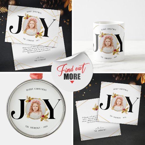 This modern Christmas card features a sleek and stylish design with a touch of festive elegance. The front of the card showcases a beautiful "JOY" design with a delicate golden frame, perfect for incorporating a treasured family photo. The unique geometric pattern with a subtle golden sheen adds a touch of sophistication and creates a striking visual appeal.