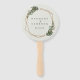 Modern boho wedding hand fan with your names and date inside of a gold geometric frame surrounded by greenery and white flowers. The backside has your personal thank you message in the same geometric frame. A botanical design that is perfect for a bohemian celebration in the summer. Frame courtesy of: <a href="http://www.freepik.com">Designed by Freepik</a>