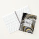 Spiral notebook with an abstract design with an agate geode mineral pattern. Gold, grey, white, and black swirl together forming elegant waves of colour.