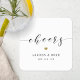 Custom-designed wedding coasters featuring "cheers" modern calligraphy with gold heart design.