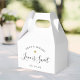 Custom-designed bridal shower wedding favour boxes featuring "love is sweet" modern hand calligraphy and gold heart design.