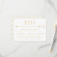 An elegant wedding RSVP card that features a gold line with two overlapping semi-circles on the right and a dot on the left positioned against a white background. The backside displays a diagonal pattern of the couple's names in gold on white, adding a sophisticated touch of grace. Please note that if your names on the back take more or less space customise it to increase or decrease the text size accordingly.
