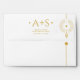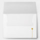 This is an elegant wedding ienvelope featuring a gold line with concentric circles and a leaf on the right side, all positioned against a white background. Your initials and dots are on the flap. It is part of our “Jewellery inspired gold foil wedding invitation collection” wedding suite.