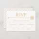 This is a refined and elegant RSVP card for a wedding that features a beautiful design with a gold line that is embellished with a flower on the right side and a dot on the left side, all set against a white background. On the reverse of the card, the names of the couple are displayed in gold on a white background in a diagonal pattern that adds an extra touch of sophistication to the overall design. If the length of your names requires any adjustments, you have the option to customise the text size accordingly to ensure that it fits perfectly on the card.