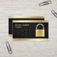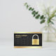 Professional locksmith business card featuring a padlock with faux gold foil accents on a black damask background. Personalise it with your name and contact details to make a lasting first impression.