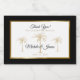 Thank your guests for celebrating with you on your special day with these modern black, white and gold mini sparkling wine labels featuring the words "Thank you for celebrating with us" and an artistic golden palm tree and elegant gold foil frame over a white background. Easily personalise them with the provided templates for the bride and groom's names and wedding date. If you need help or matching items, please contact me.