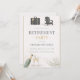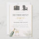 Modern gold and neutral design with champagne pour detail, travel suitcase and lounge chair accents, and soft botanical touches on a textured background. Clean serif typography balances the layout, suited for retirement party gatherings and polished evening celebrations.