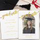 Celebrate your daughter’s graduation in style with this elegant gold script arch photo graduation announcement card—perfect for high school, college, or university graduates. This trendy arch photo graduation invitation features a modern stylish white background paired with luxurious gold script calligraphy, creating a modern and eye-catching design that beautifully honours this important milestone. Easily personalise the layout with your graduate’s favourite senior portrait and add custom event details using the intuitive, editable template. Whether you’re planning a graduation party, open house, or simply sending formal graduation announcements, this printable photo card is a meaningful and stylish way to share her achievement with loved ones. Designed by artist Catherine Sweetman, this personalised graduation invitation blends timeless elegance with a contemporary twist, making it a cherished keepsake. Perfect for 2025 graduation announcements, senior photo cards, black and gold graduation invitations, and custom grad party invites for daughters. An ideal choice for parents seeking stylish graduation cards for girls with photos