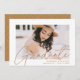 Invite guests to celebrate the graduation with our modern photo graduation party invites. The trendy graduation party invites feature the graduate's photo with "Graduate" in a gold modern calligraphy script overlay. Personalize the front of the invites by adding the graduate's name, school name, and graduation year. The invite reverses to display your graduation party details and a trendy gold and white dotted geometric pattern.