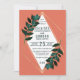 This elegant, simple, and modern wedding invitation is perfect for a classy and formal event. It features hand-painted emerald teal green leaf greenery arrangments on top of a faux gold geometric terrarium border and a simple terracotta coral orange background. It's chic, luxe, and artsy with a country rustic feel; perfect for an outdoor, barnyard, or formal event.